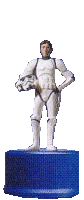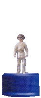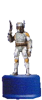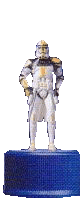 両腕の形が菱形状になっており、腰の上で両サイドに張り出した突起が確認できた場合、この4体に絞られてくる。「ハン・ソロ」「トルーパー」はそれぞれヘルメット・ブラスターをもっており、辛うじて判別材料になるであろうが、「タイ・ファイ」「コマンダー」の2体に至っては正面写真だけでは、ハッキリ言って判別は不可能であろう。 |